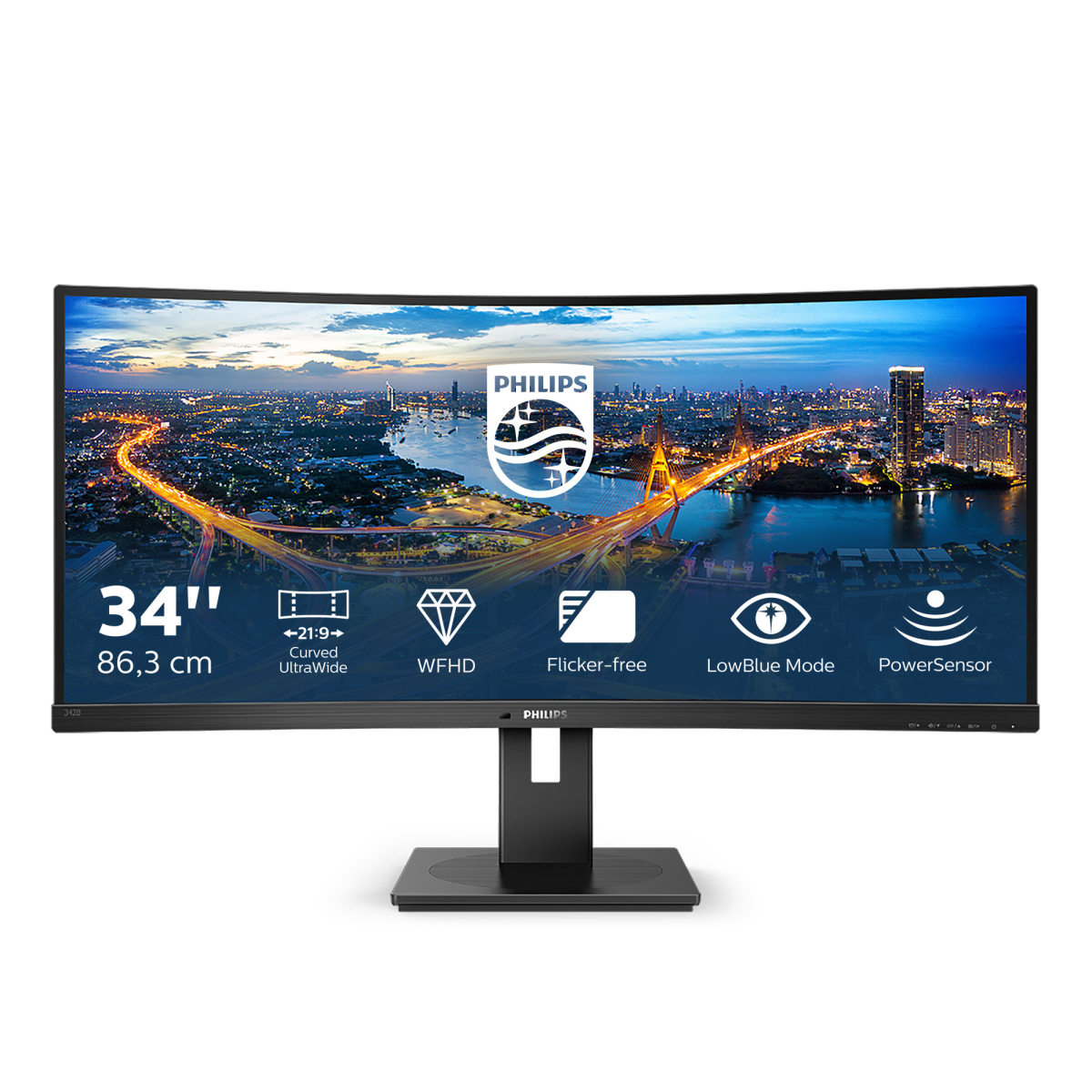 The Philips B line 34″ curved UltraWide display gives a wrap-around view of your work. A crisp WFHD display and ergonomic stand design make for optimal working conditions. Eye comfort features with TUV certification to reduce eye fatigue.